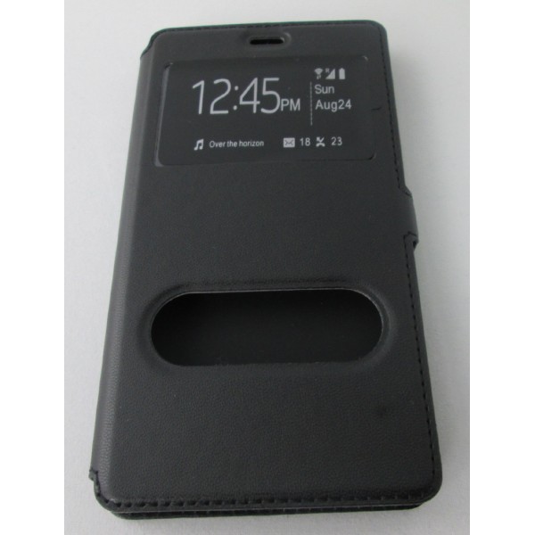 étui portefeuille huawei P8 noir avec fenêtres et support vidéo intérieur en silicone