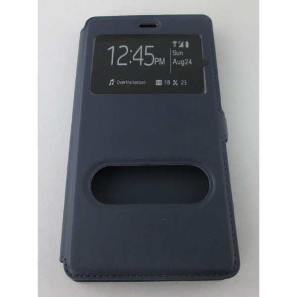 étui portefeuille huawei P8 bleu foncé avec fenêtres et support vidéo intérieur en silicone