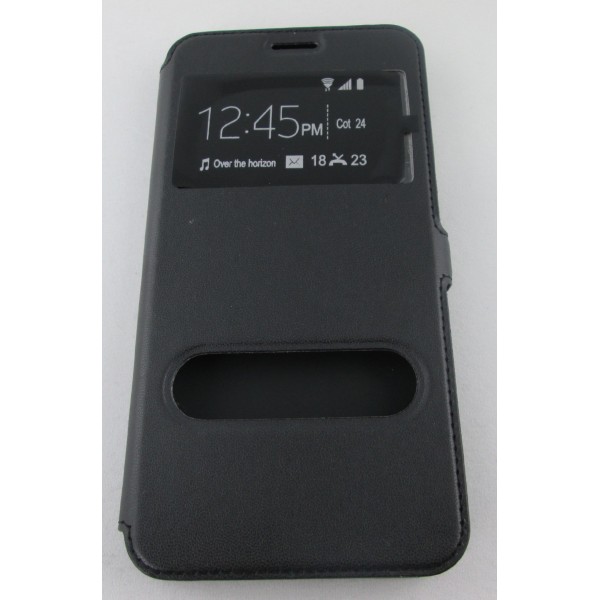 étui portefeuille samsung galaxy A8 noir avec fenêtres et support vidéo intérieur en silicone
